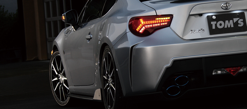 トムス初のオリジナルLEDテールランプ。落ち着きのあるシングルトーンのブラキッシュレッド仕様とクリアタイプの二種類を設定。点灯時はLEDチューブによる特徴あるデザインで、明確な差別化と高い視認性を実現。自動車メーカーに納入実績のあるランプメーカーでの製造により高い信頼性を確保すると共に部品型式認証"Eマーク"も取得した。