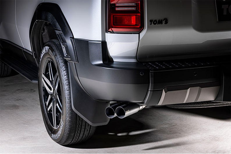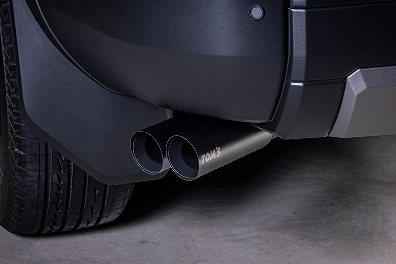 斜め後方に配置されたテール出口は、テールゲート側での荷物の積み下ろし時に、ディーゼル特有の高温排気ガスを浴びることがないように設計。また、ヒッチメンバー使用時にもトレーラーなどへの影響を抑えています。テール出口は耐熱性600℃の艶消し黒仕上げとし、「TOM’S」ロゴを配することで、さりげなくも確かな存在感を演出しています。