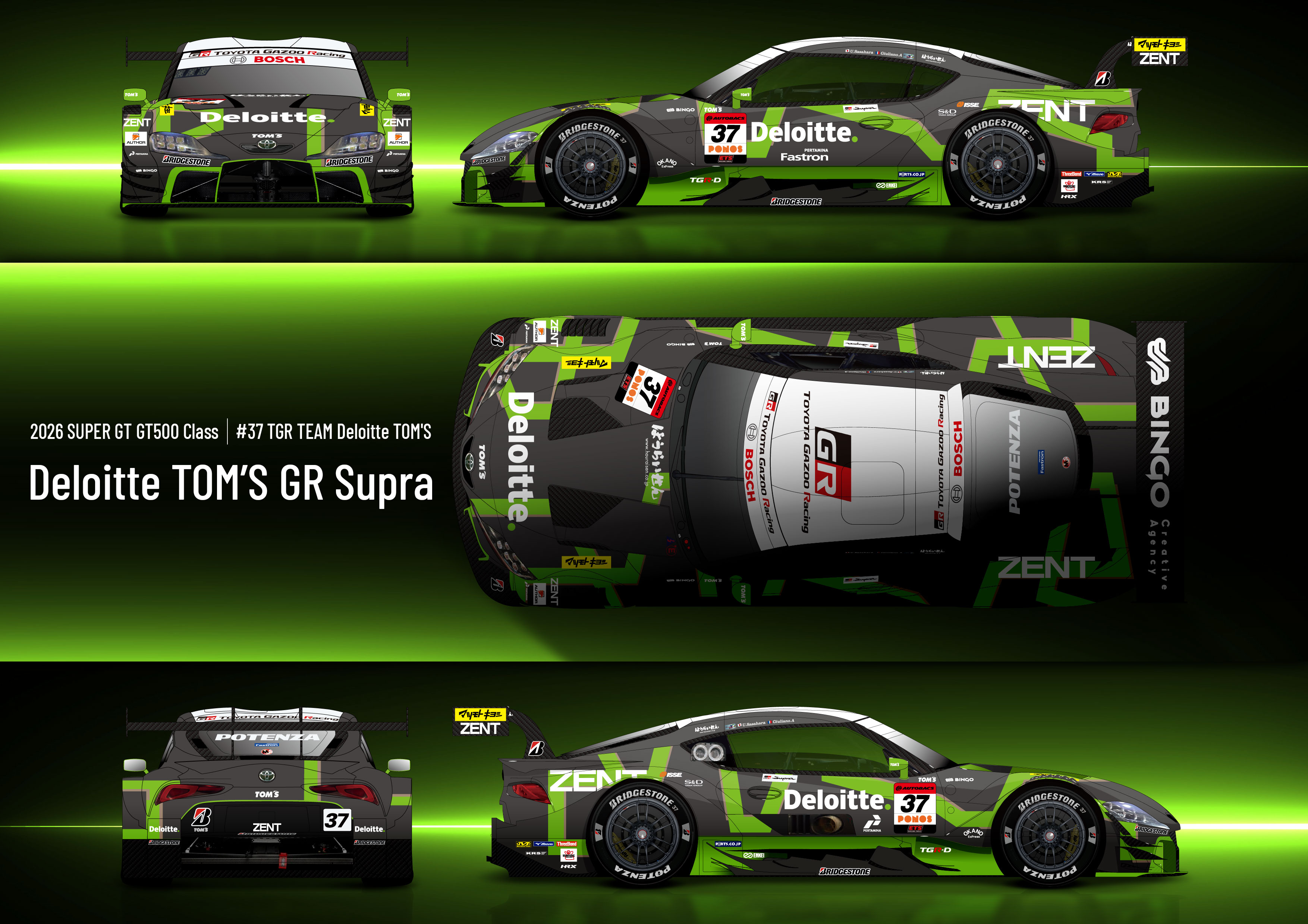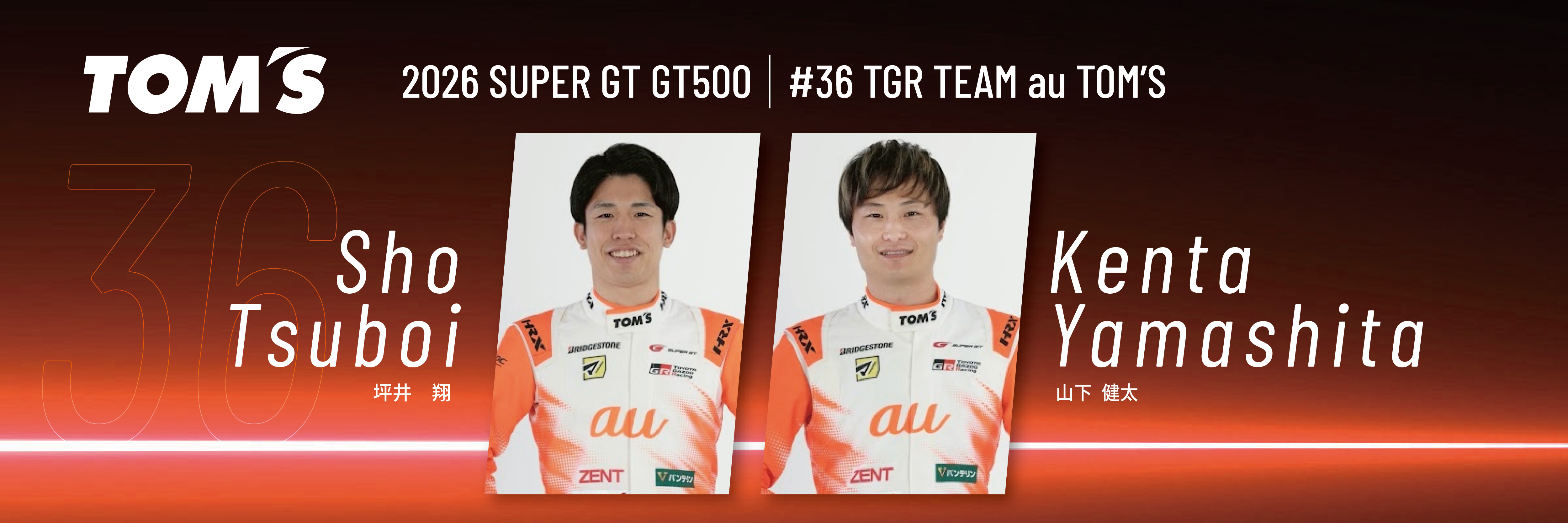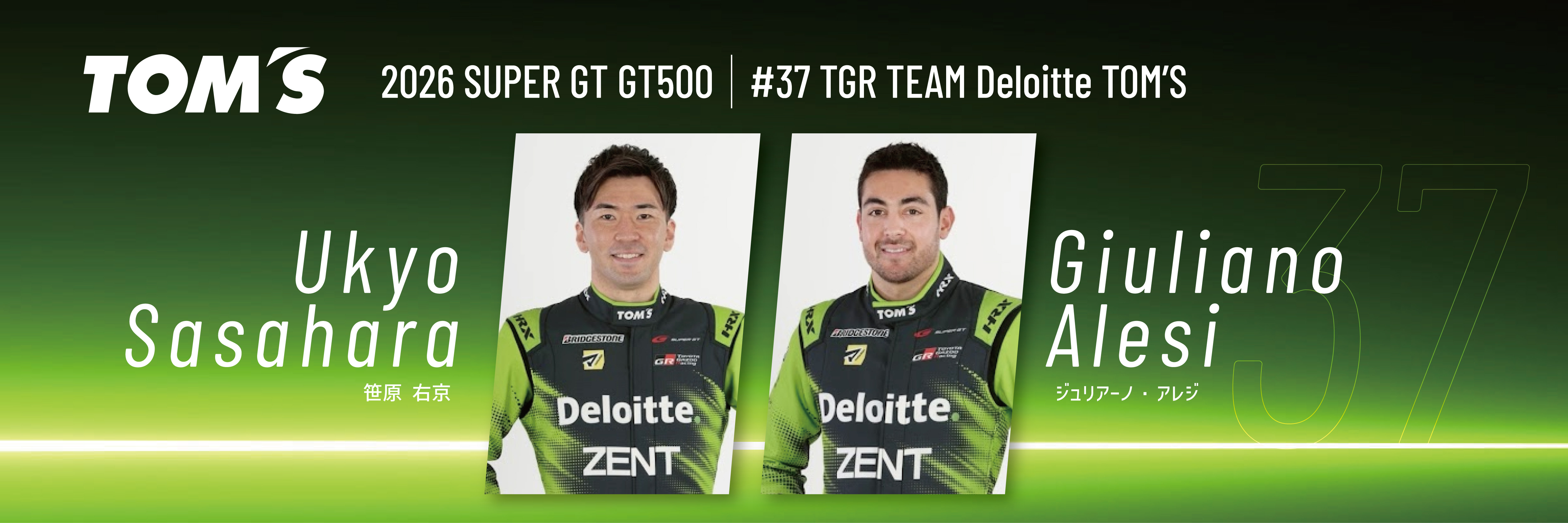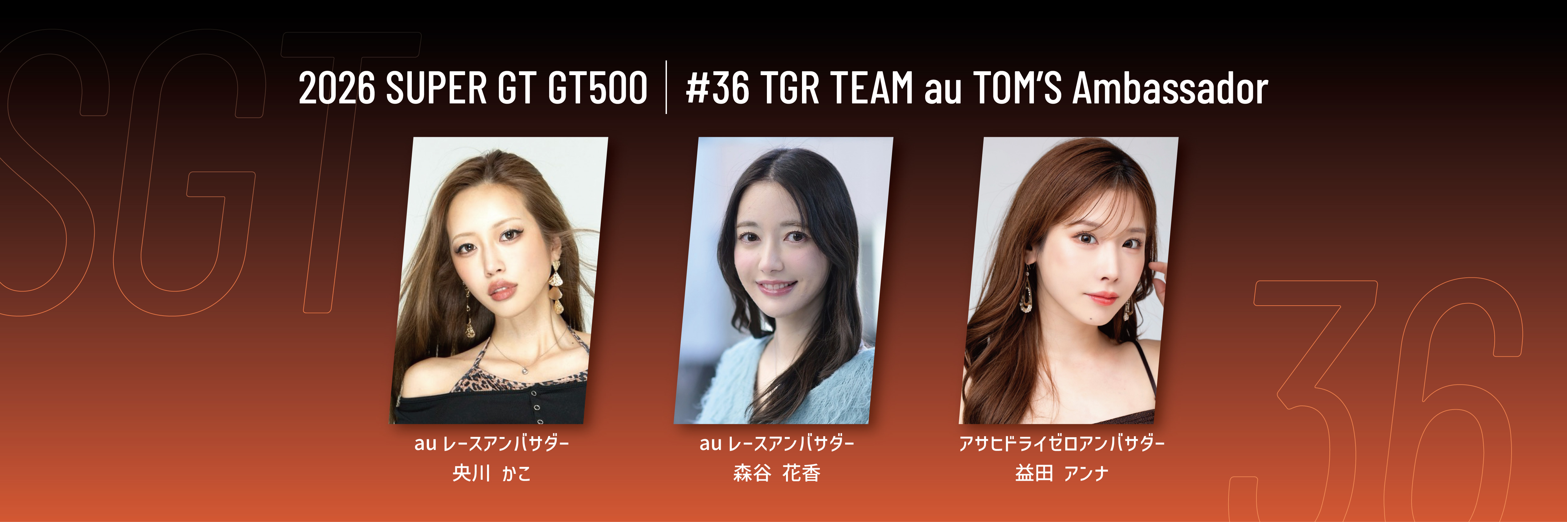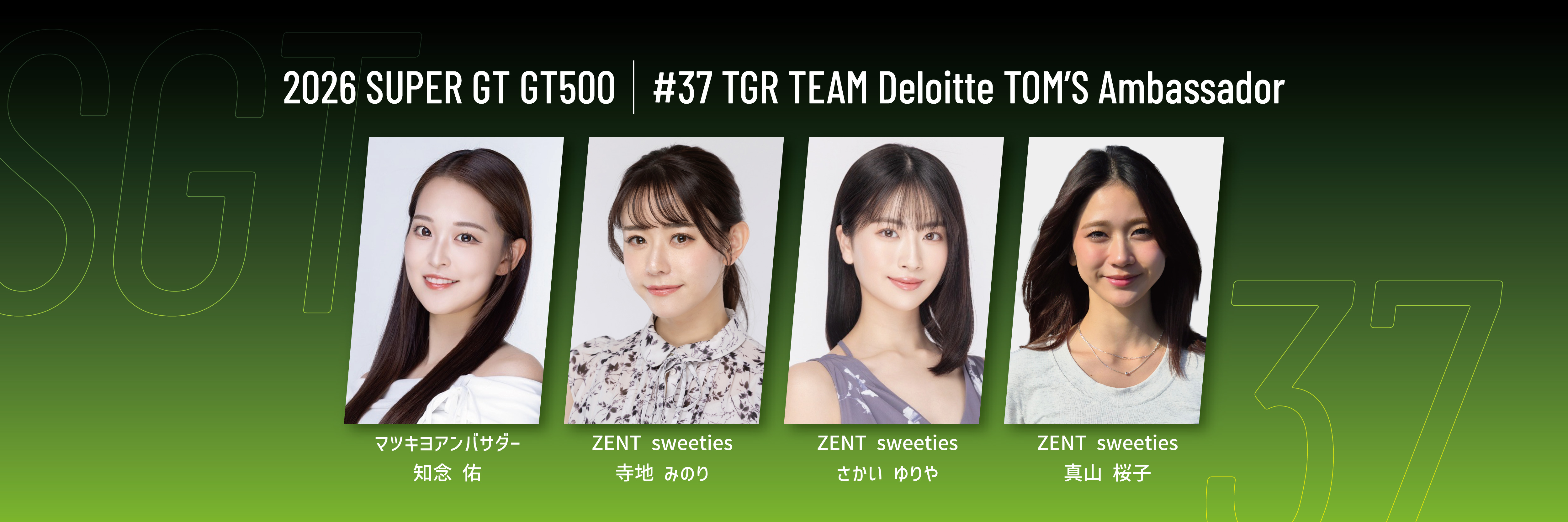 「SUPER GT」は、昨年までと同様、GT500クラスへ2台体制で参戦。 史上初のシリーズ3連覇を達成した1号車は、初心を忘れることなくゼッケンを36へもどし、本年も「KDDI株式会社」様をメインスポンサーに、「TGR TEAM au TOM’S」として活動いたします。ドライバーは、昨年のチャンピオンコンビとなる坪井翔選手と山下健太選手が継続参戦。監督も伊藤大輔が継続し、前人未踏の4連覇をかけて挑みます。 レースアンバサダーは「auレースアンバサダー」として「央川かこ」と「森谷花香」が務めます。 また、「アサヒビール株式会社」様の「アサヒドライゼロアンバサダー」は、「益田アンナ」が務めます。 37号車は、「合同会社デロイト トーマツ」様をメインスポンサーに、「TGR TEAM Deloitte TOM’S」として活動いたします。ドライバーは昨年に引き続き、笹原右京選手とジュリアーノ・アレジ選手のコンビで参戦。監督も昨年同様にミハエル・クルムが継続いたします。 レースアンバサダーは、「マツキヨアンバサダー」として、「知念 佑」、「ZENTsweeties」として、「寺地 みのり」「さかい ゆりや」 「真山 桜子」 の計4名が務めます。
